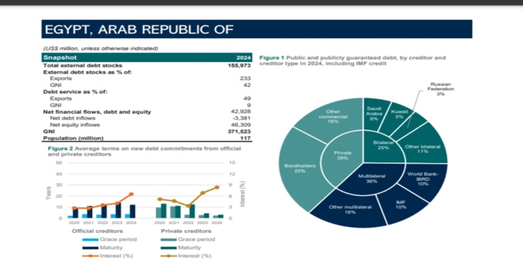 وذكر التقرير إن عدد سكان مصر يبلغ 117 مليون نسمة، ملمحا إلى أن الديون العامة والديون المضمونة حكوميا، حسب الدائن ونوعه في عام 2024، بما في ذلك قروض صندوق النقد الدولي؛ تتمثل في دائن ثنائي بنسبة 25 بالمئة، ودائن متعدد الأطراف بنسبة 36 بالمئة، ودائن خاص بنسبة 39 بالمئة، لافتا إلى أن للسعودية 6 بالمئة، وللكويت 5 بالمئة ولروسيا 3 بالمئة من حجم ديون مصر.