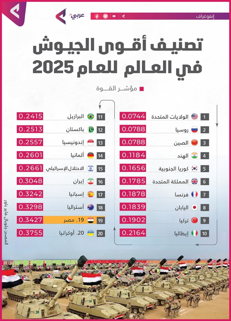 وحل الجيش المصري في المرتبة التاسعة عشر ضمن قائمة أقوى 20 جيشاً في العالم للعام 2025، والتي نستعرضها في الإنفوغراف التالي: