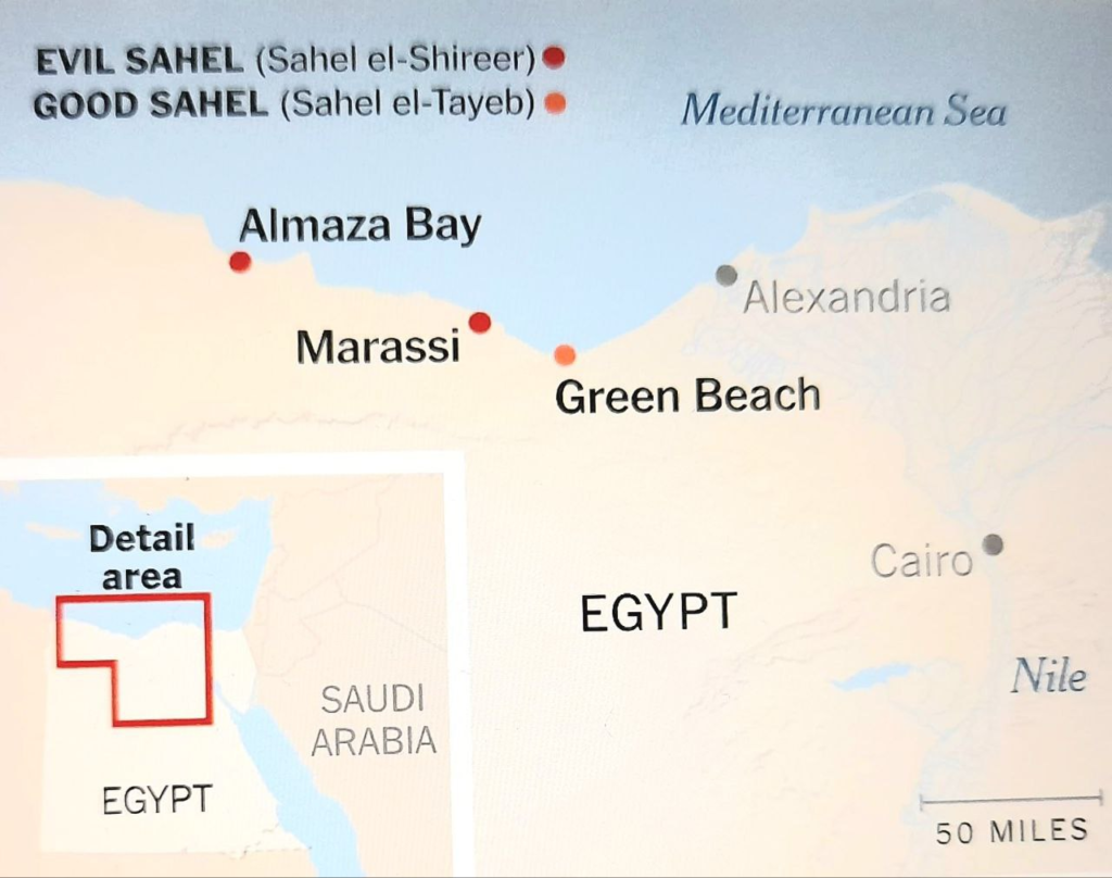 وتحدد الخريطة أدناه موقع خليج ألماظة ومراسي، المعروفين باسم “الساحل الشرير”، والشاطئ الأخضر، المعروف باسم “الساحل الطيب”، بالقرب من الإسكندرية، مصر.