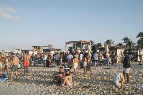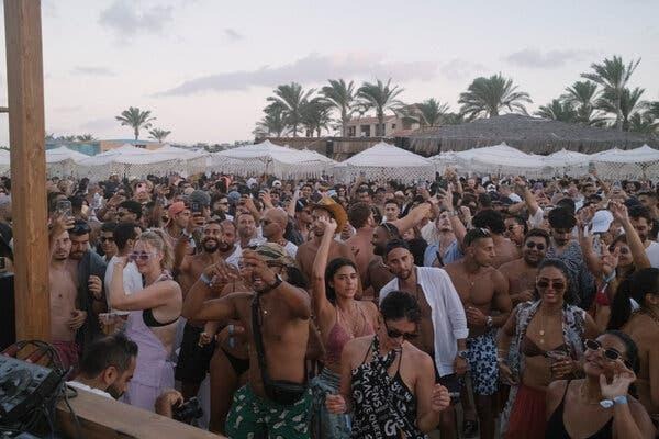 رجال ونساء، يرتدون ملابس شاطئية متحررة، و يرقصون في أحد المهرجانات داخل مجمع خليج ألماظة في الساحل الطالح، المعروف بـ “الساحل الشرير”
